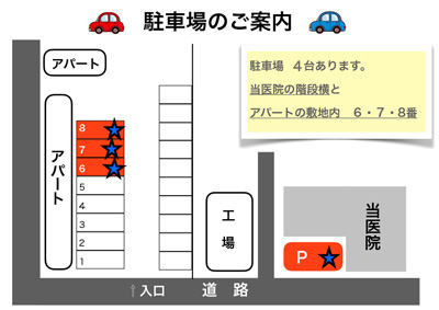 駐車場4台あり (クリニック前1台、アパートの敷地内6、7、8番)
